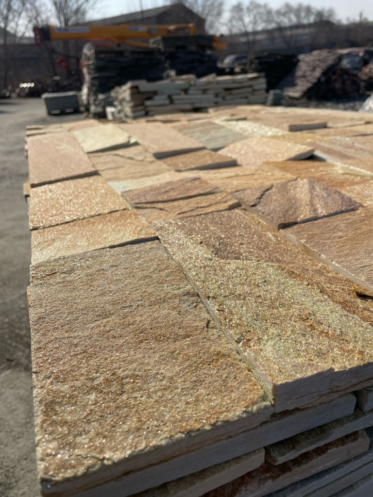 Камень златолит жёлтый добывается на карьере и разделяется по толщинам для традиционного применения в строительстве - облицовки и мощения: